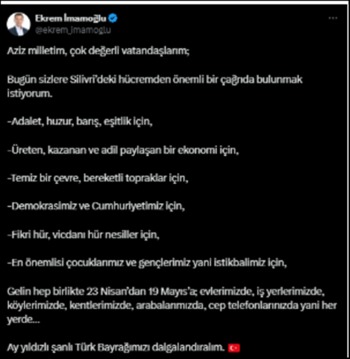 Ekrem İmamoğlu’ndan Silivri’den Türk Bayrağı Çağrısı: Her Yeri Donatalım
